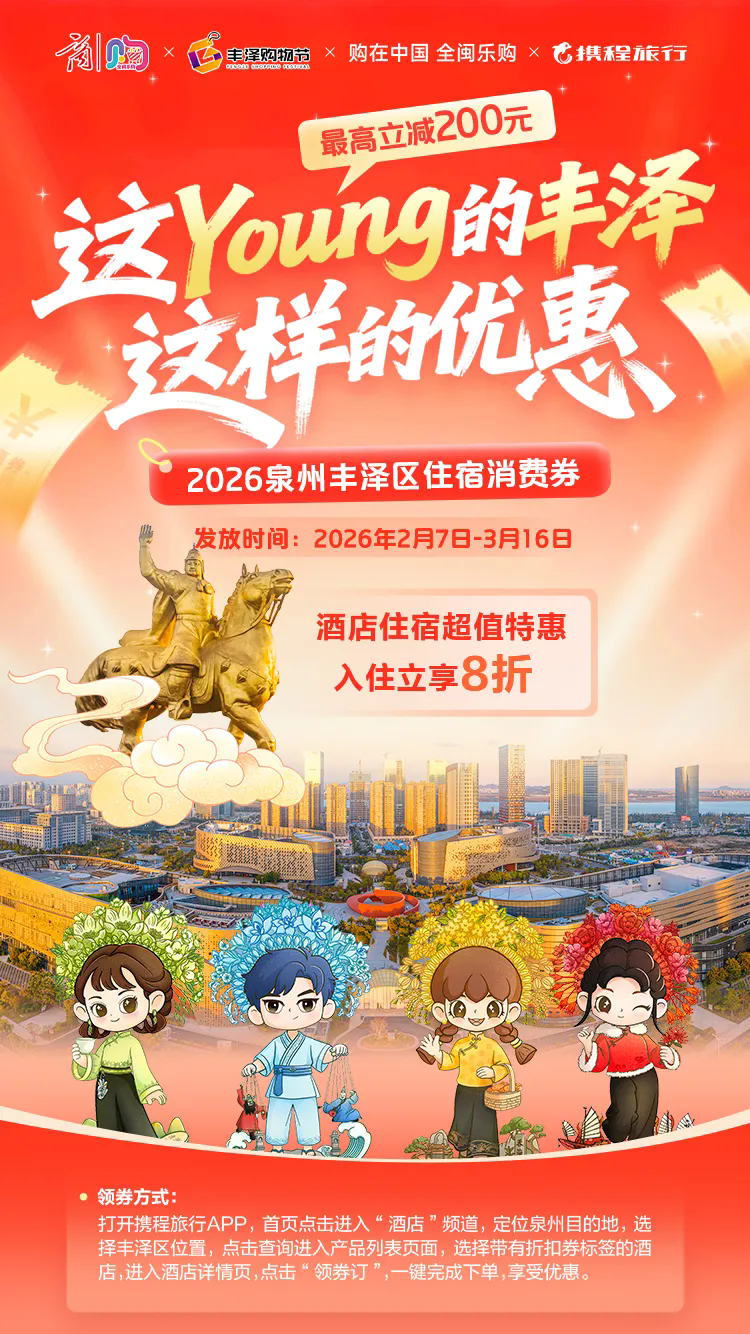 活动内容:采取“政府投流、企业配套、平台补贴”的方式,通过携程平台发放百万住宿消费券(携程APP“丰泽购物节专区”定向投放),以抢券方式,吸引外地游客来丰泽、游丰泽、住丰泽。同时,鼓励酒店推出“住宿+餐饮”套餐,激活异地游客住宿消费。更多详情最高立减200元!2026丰泽住宿消费券开抢啦~
