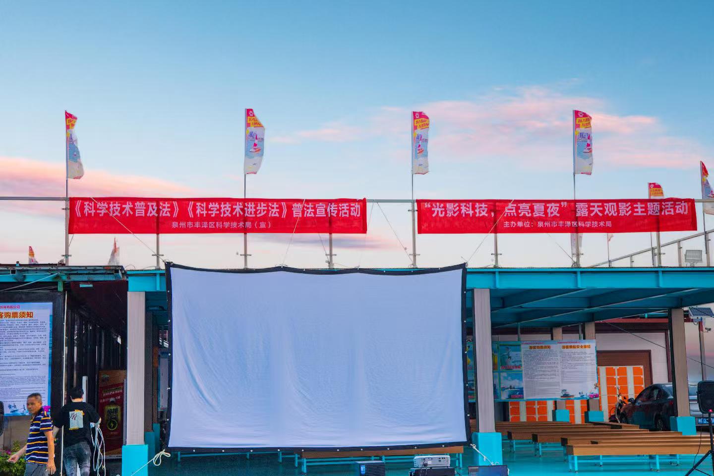 为全面贯彻落实党的二十大和二十届二中、三中全会精神,深入实施创新驱动发展战略,深化“文化+科技+旅游”业态创新发展,助力提升丰泽区“滨海浪漫线”的关注度与吸引力,不断丰富群众生活,9月2日晚上,丰泽区科技局在泉州浔海乐游(丰泽区丰海路555号)开展“光影科技,点亮夏夜”露天观影暨丰泽区全国科普月活动,吸引120多人次参与。活动现场开展露天观看电影,吸引众多居民游客驻足观赏,点亮城市夜空,运用先进的数字放映设备,增强公众文化获得感,丰盈城市文化记忆。同时,现场进行科普宣传无人机足球、无人机模型、机器人编程等科技元素的产品和服务,以寓教于乐的方式,吸引众多家庭亲子参与,助力青少年等重点人群科普知识水平提升。