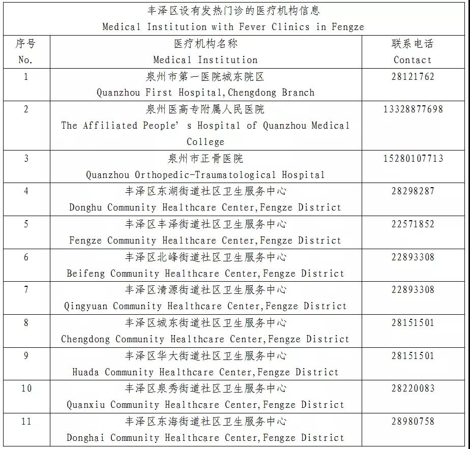 丰泽辖区内医疗机构设有发热门诊的共有11家,详细名单附后。