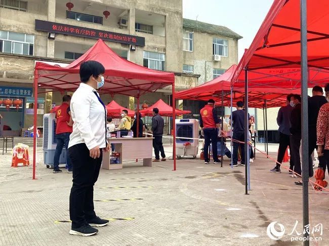丰泽区后亭社区书记张月玲在核酸检测点维持秩序。人民网 吕春荣摄