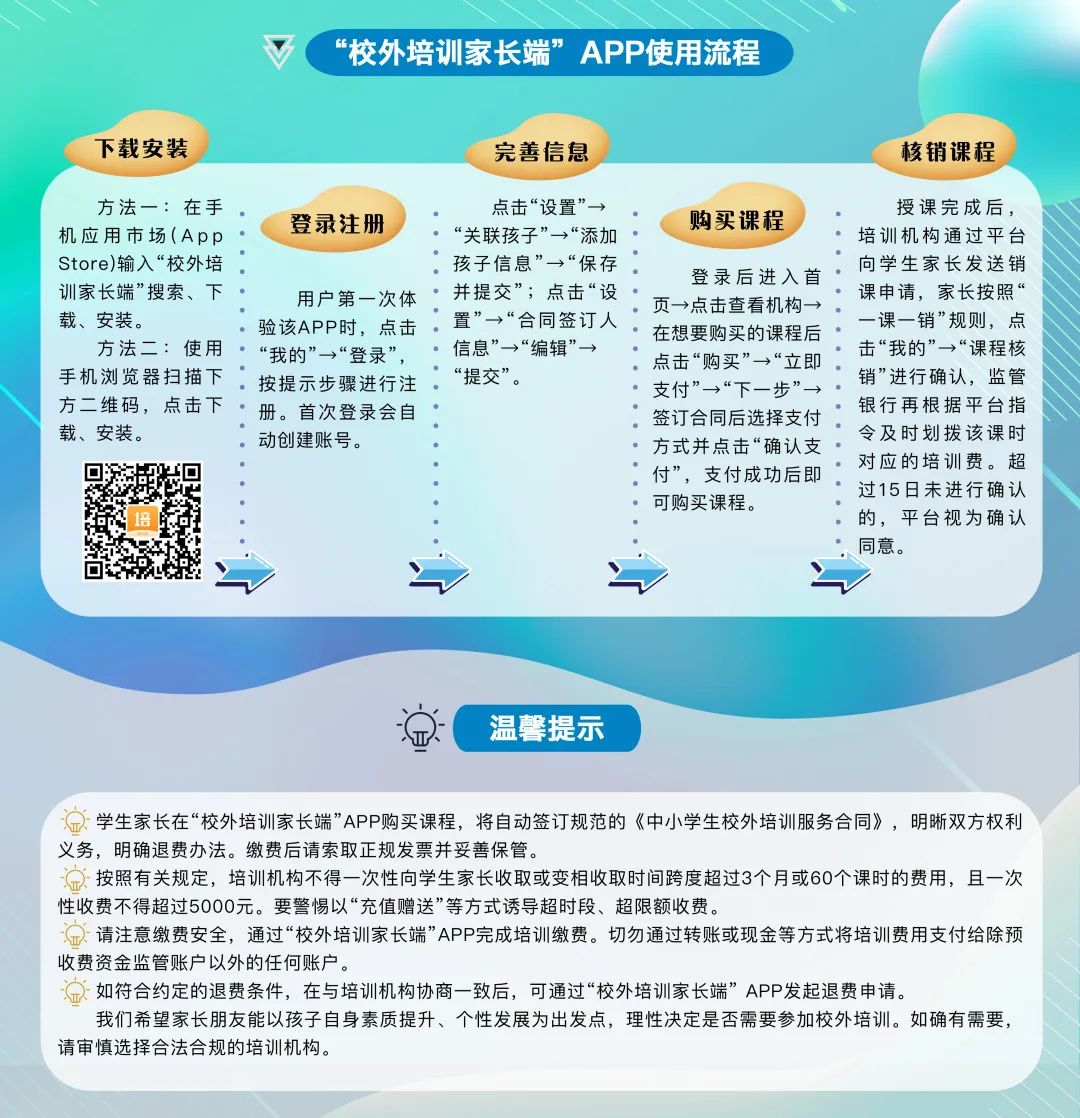 为切实维护广大学生和家长的合法权益,教育部推出了“校外培训家长端”APP,学生家长可通过“校外培训家长端”APP选择合法正规的培训机构,实现选课、购课、退费的服务。学生家长在“校外培训家长端”APP购买课程,将自动签订规范的《中小学生校外培训服务合同》,明晰双方权利义务,明确退费办法。缴费后请索取正规发票并妥善保管。切勿通过转账或现金等方式将培训费用支付给除预收资金监管账户以外的任何账户。