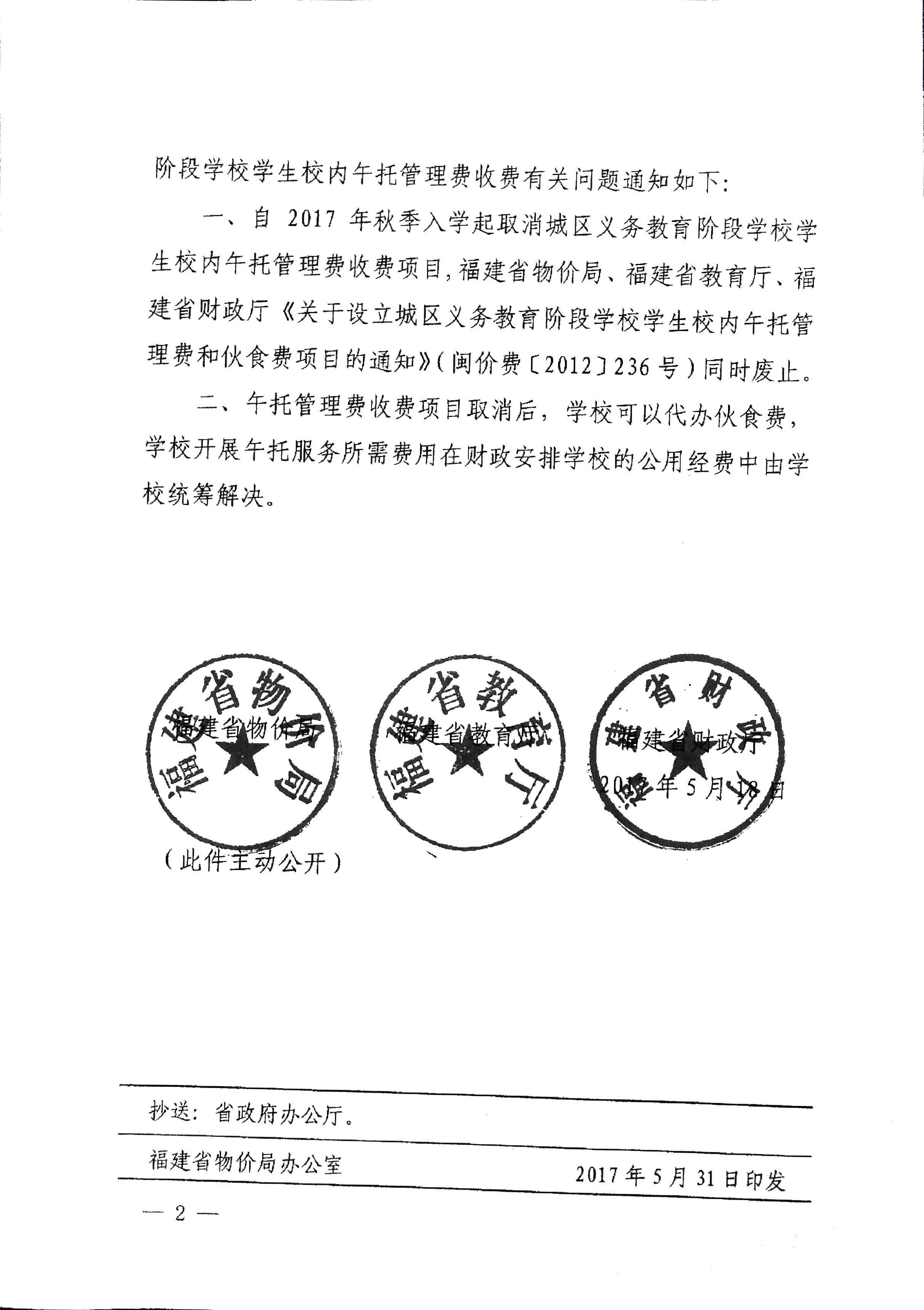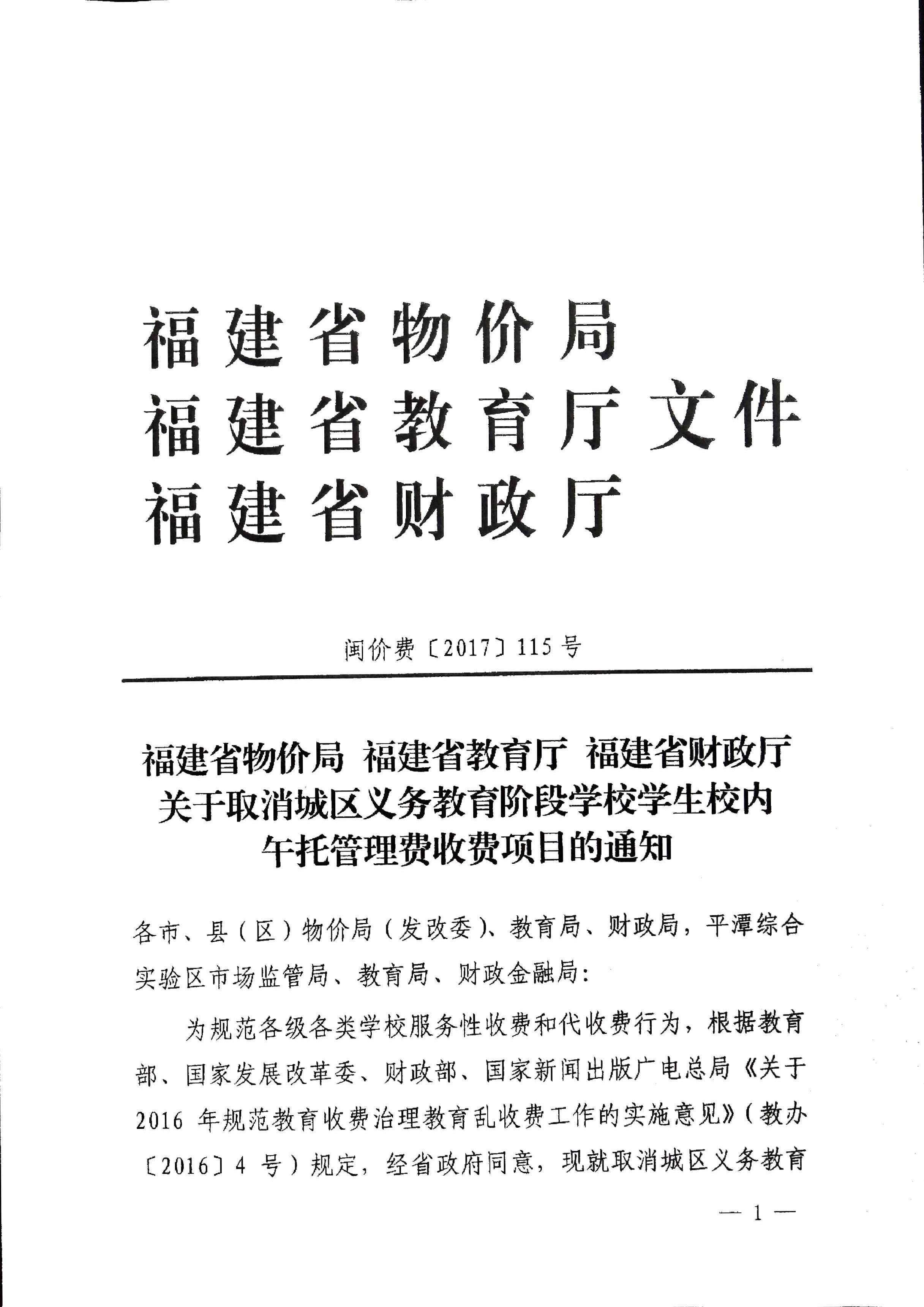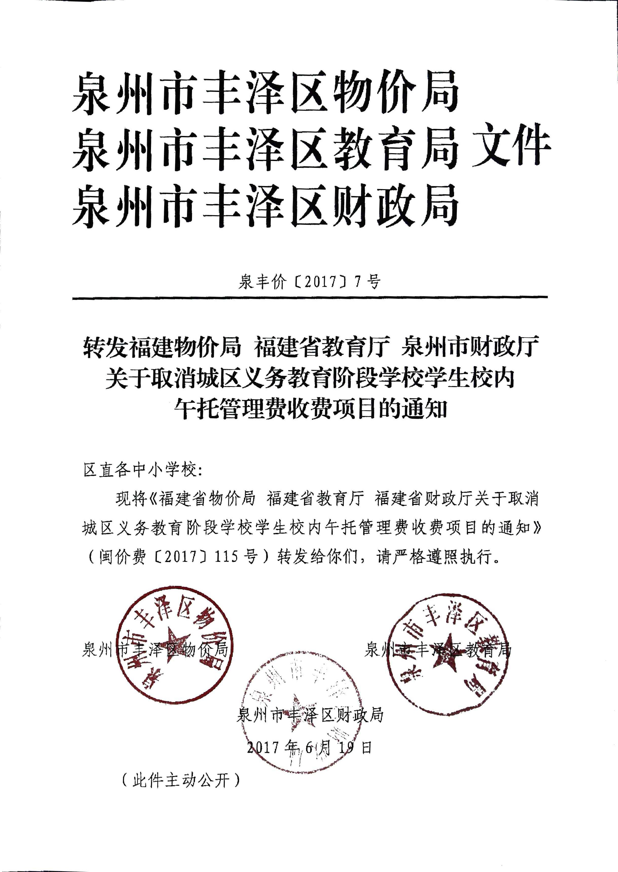 区直各中小学校: 现将《福建省物价局福建省教育厅福建省财政厅关于取消城区义务教育阶段学校学生校内午托管理费收费项目的通知》(闽价费〔2017〕115号)转发给你们,请严格遵照执行。 泉州市丰泽区物价局 泉州市丰泽区教育局 泉州市丰泽区财政局 2017年6月19日 (此件主动公开)