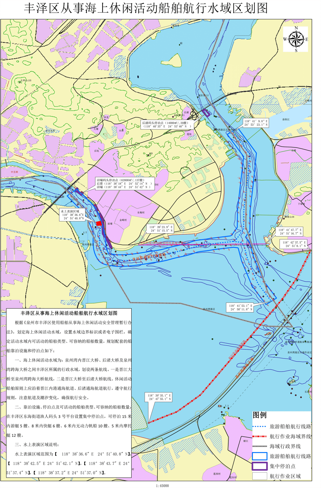 请从事海上休闲活动的船舶严格按照《泉州市丰泽区使用船舶从事海上休闲活动安全管理暂行办法》相关要求,在《丰泽区从事海上休闲活动船舶航行水域区划图》划定的区域活动范围内进行停泊和活动。