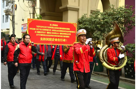 活动现场,由执业律师、司法行政工作人员等50多名法律专业人员组成的法律服务团,与130多名民营企业代表一起,就企业的法律风险排查防范问题进行交流,并签订服务协议。活动举办方向部分企业主代表赠送了由区依法治区办与法研会合编的“七五”普法读本,向法律服务团授旗。伴随着鼓号队的随行演奏,全体嘉宾、律师、企业主参加了法治宣传踩街活动,吸引了众多群众的围观。