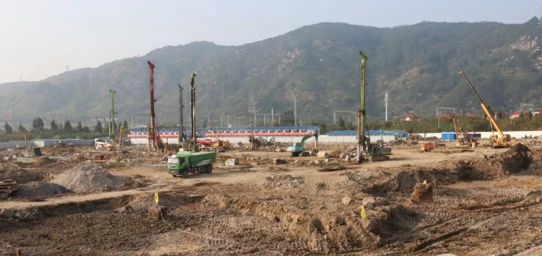在泉州市正骨医院北峰院区项目工地,多台桩基正在进行打桩作业,钩机正在进行土方清理,运输车辆进进出出,现场施工有条不紊。