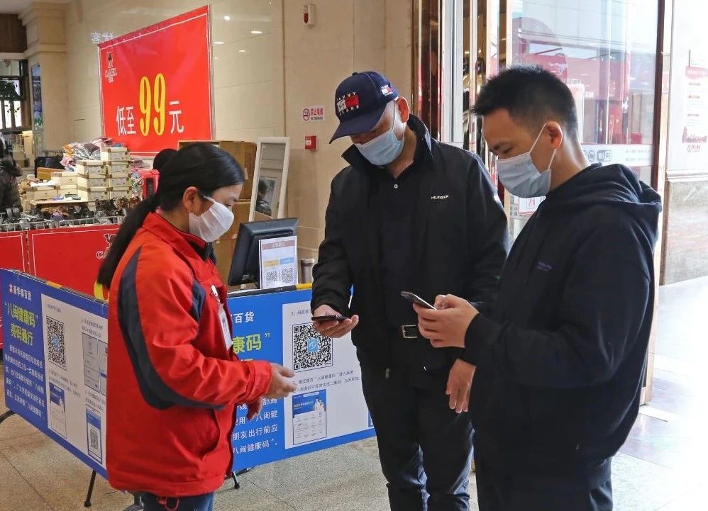 在丰泽广场新华都百货外,放置了温馨提示牌和播音小喇叭,提醒顾客配合测量体温、备好健康码、佩戴口罩、保持距离,在商场收银处、扶梯口也设置了保持距离的等候线和等候区。