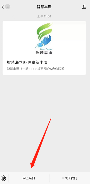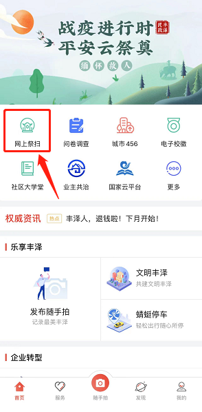 方式一 关注“智慧丰泽”微信公众号,点击自定义菜单中的“网上祭扫”即可进入平台。