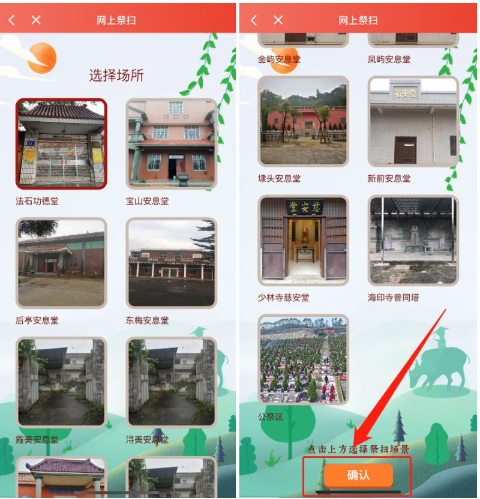 选择对应的祭扫场所(目前提供泉州宏福园、丰泽区20家公益性骨灰寄存点以及一个公祭区),随后点击底部“确认”按钮。