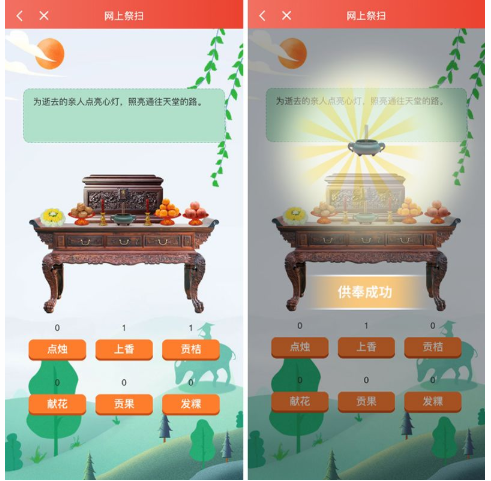 网上祭扫提供多种祭扫形式,包括点烛、上香、贡桔、献花、贡果、发粿六种形式,点击不同的祭扫形式系统会自动生成对应的祭扫场景。