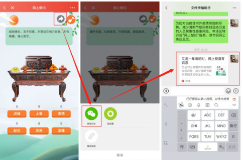 点击“网上祭扫”平台右上角的分享按钮,即可分享到微信中,让亲朋好友共同参与祭扫。