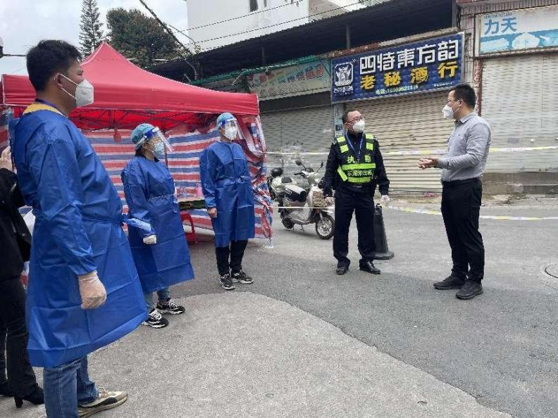 在柑舍头封控点现场,凤山社区工作人员、交发抗疫志愿者及专班工作人员各就其位、各司其职,封控点管理严格有序。指挥部临时党支部第一书记洪冬青详细了解了封控点值班值守、居民生活保障、管理服务及环境消杀等工作,实地查看封控点各项防控措施落实情况,现场研判、协调解决相关问题。