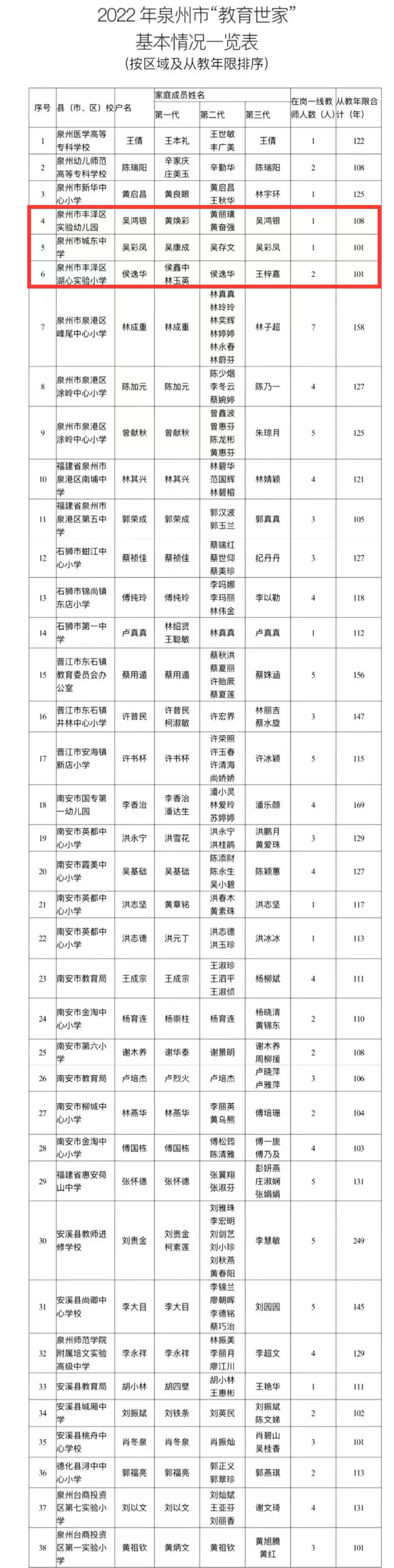 许书杯家庭,是2022年度泉州市“教育世家”之一。今年入选的38户“教育世家”,从教年限合计最长的是249年。据了解,1991年,泉州在全市范围内开展“教育世家”申报活动,至今已经逾30年。