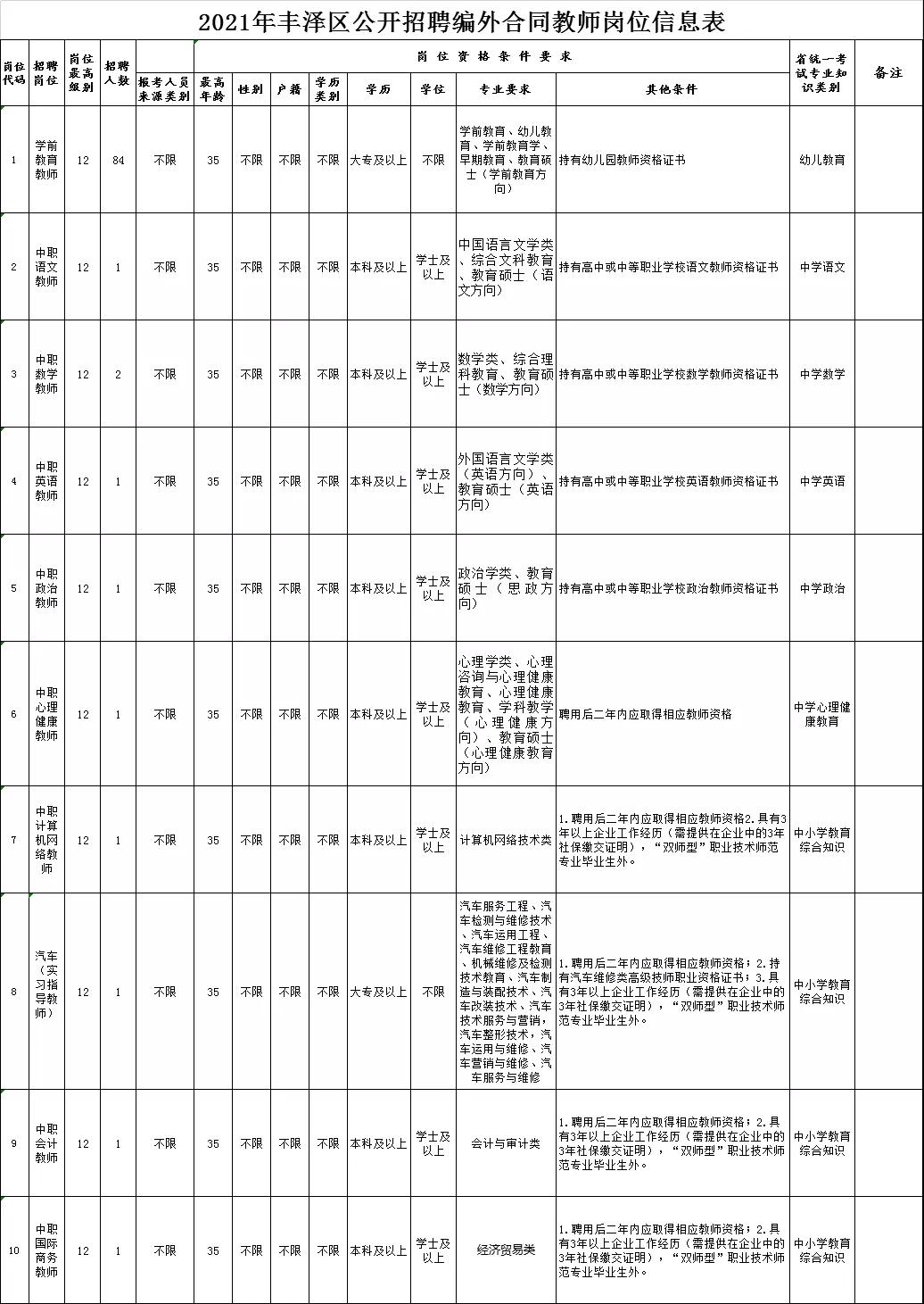本次计划招聘编外合同教师94名,具体岗位及条件详见《2021年丰泽区公开招聘编外合同教师岗位信息表》。