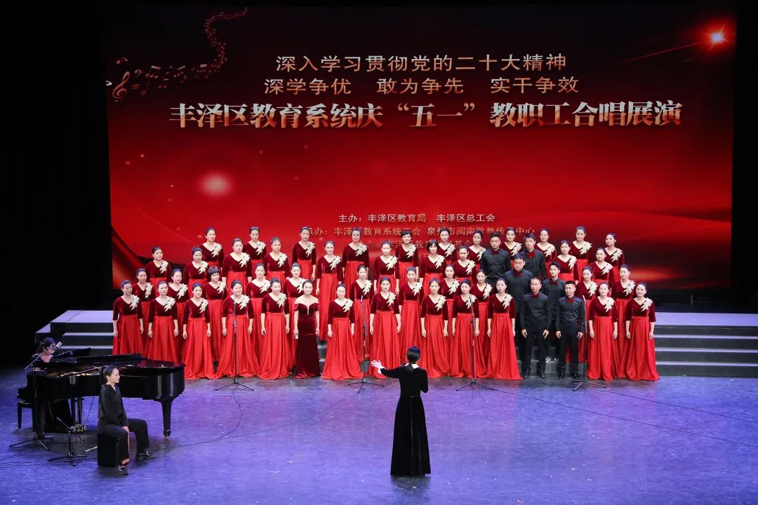 歌声振奋人心,歌声催人奋进。26日晚,泉州歌剧院歌声嘹亮、激情澎湃,丰泽区教育系统“深学争优、敢为争先、实干争效”暨庆祝“五一”教职工合唱展演在这里精彩举行。泉州市第九中学、泉州师范学院第二附属小学、泉州工商旅游职业中专学校、丰泽区实验幼儿园等10支优秀学校代表队尽情演绎、放声歌唱,用一首首慷慨激昂、饱含深情的歌曲,展现了丰泽教育人传承红色基因,弘扬革命精神,在党的旗帜引领下续写荣光的豪迈气概。